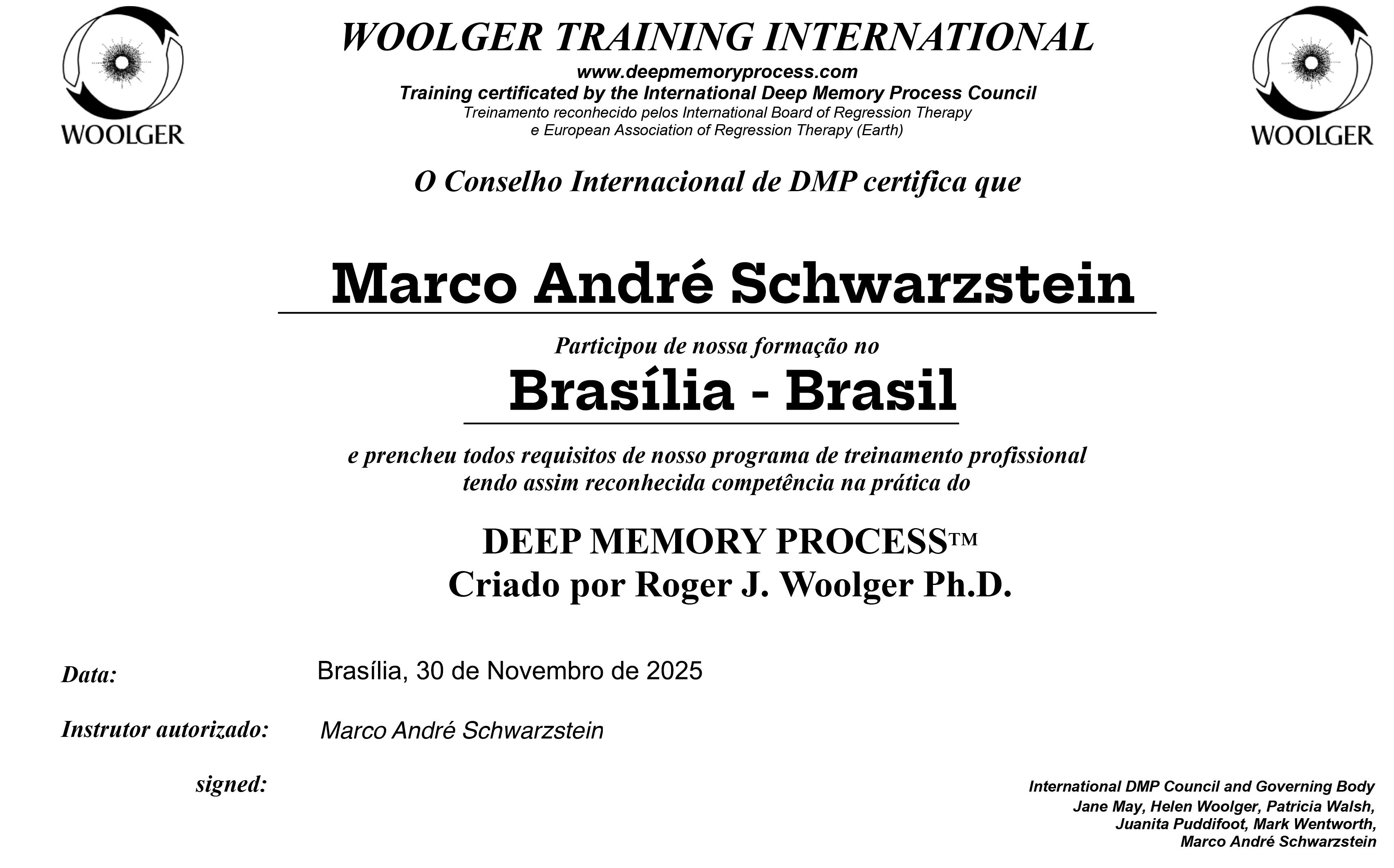 Ao completar o curso, você ganha não só um diploma do Deep Memory Process, certificado internacionalmente por EARTH – Earth Association for Regression Therapy e IBRT – The International Board for Regression Therapy mas também se torna um terapeuta listado no site do Deep Memory Process no Brasil e no exterior, aprimorando assim a apresentação de seu perfil profissional.